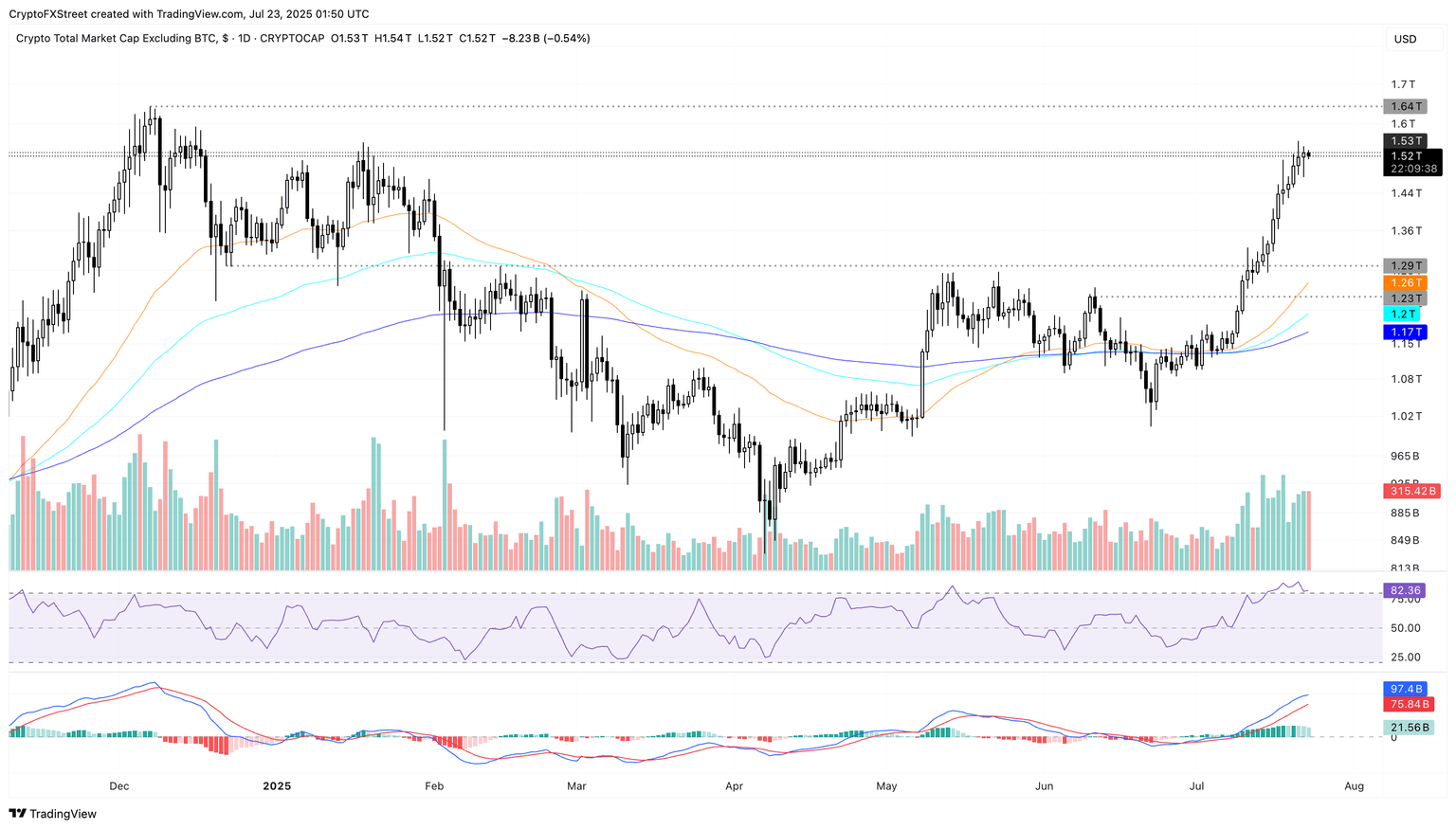 The total cryptocurrency market capitalization, excluding Bitcoin (BTC), hit a daily close of $1.53 trillion, the highest in eight months. The altcoin market has recorded a 30% surge in July so far, suggesting a capital rotation from Bitcoin to altcoins, which indicates an altcoin season may be around the corner.