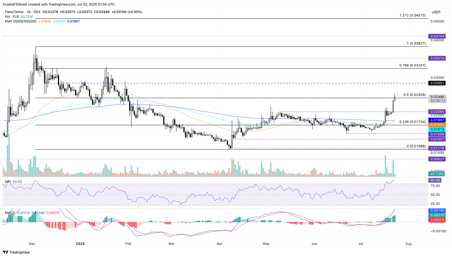 Flare edges higher by 4% at press time on Wednesday, extending the nearly 15% gains from the previous day. The uptrend challenges the 50% level at $0.02458, which is drawn from the $0.03827 peak on December 3 to the $0.01088 low on April 7.