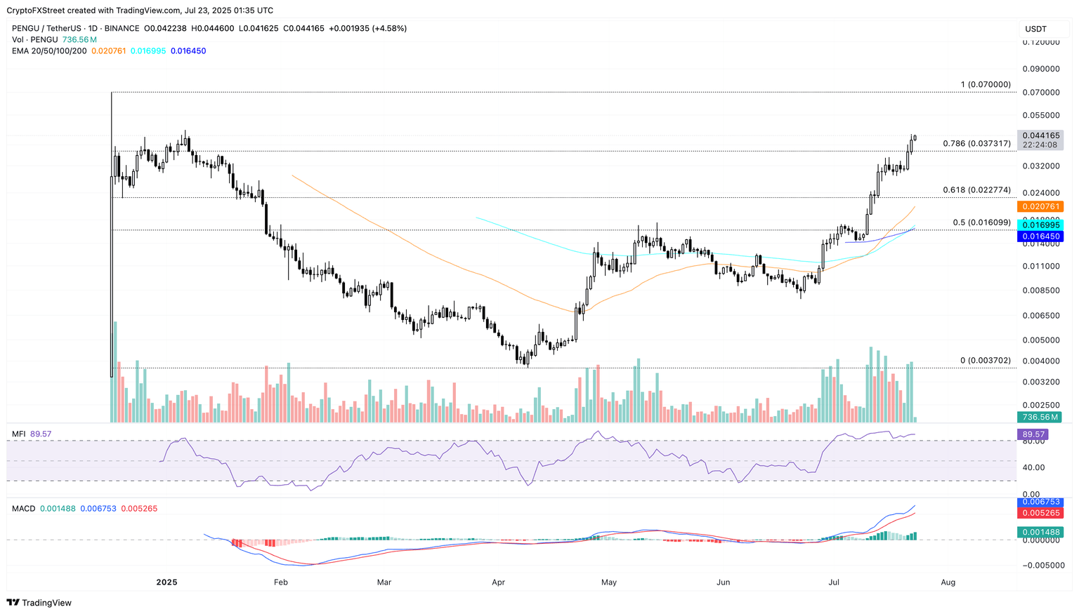 Pudgy Penguins maintain a bullish trend with the third consecutive positive candle so far this week, accounting for an over 45% rise. The uptrend inches closer to the $0.05000 psychological level as it exceeds the 78.6% retracement level at $0.03731, drawn from $0.07000 on December 17 to $0.00370 on April 9.