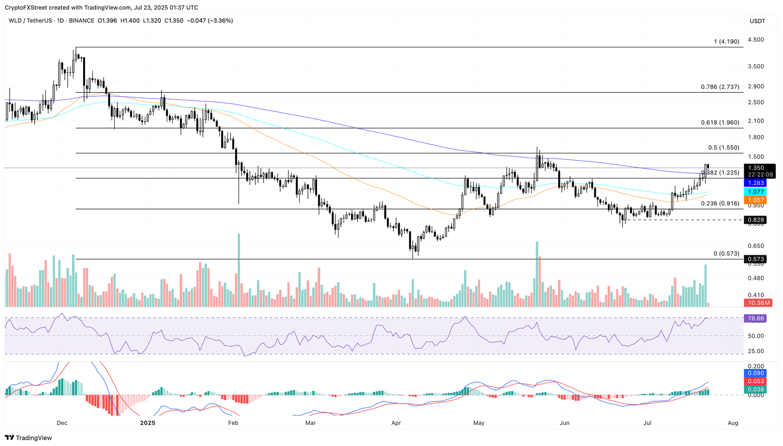 Worldcoin ticks lower by 3% at press time on Wednesday, following a nearly 13% surge on Tuesday. WLD holds above the 200-day EMA at $1.28 and the 38.2% Fibonacci level at $1.22, drawn from $4.19 on December 6 to $0.57 on April 7.