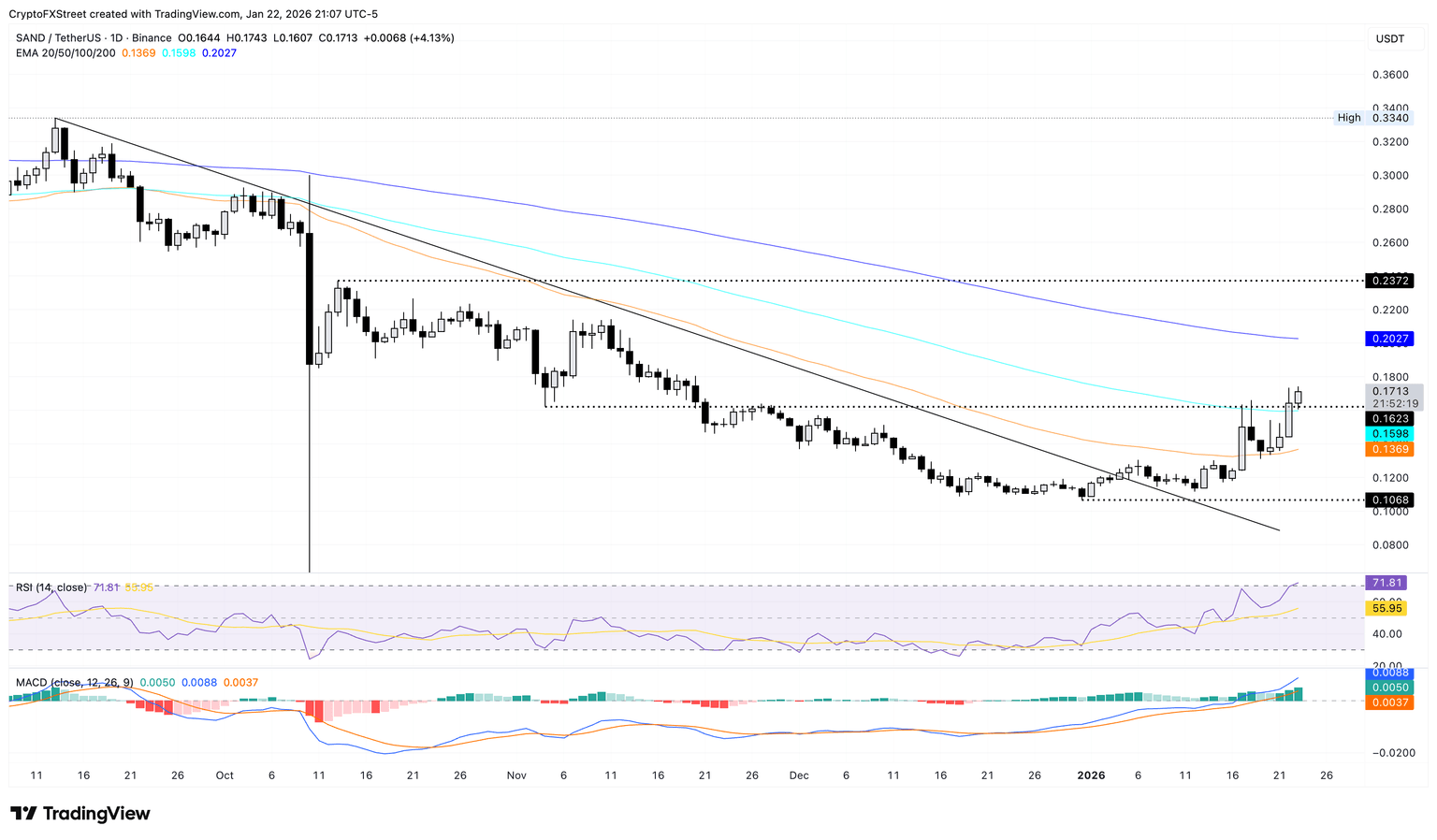 - Sandbox is up 4% above the 100-day EMA on Friday, extending 14% rise from the previous day.