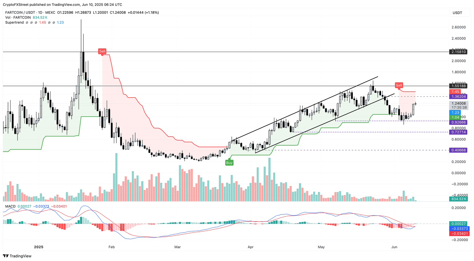 Still, according to the Supertrend indicator, the breakdown of the rising channel in May led to a bearish trend. To reinstate an uptrend, Fartcoin must surpass the indicator line at $1.45, a potential buy signal for trend traders.