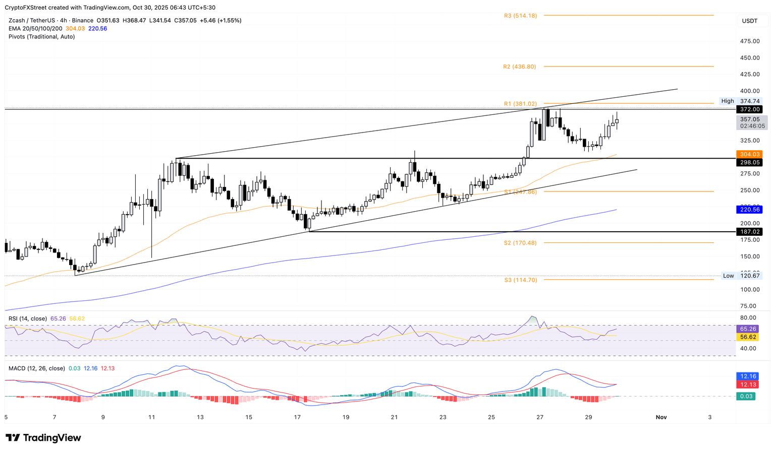 Zcash trades above $350 at press time on Thursday, following the 11% rise on the previous day. The privacy coin aims for its record high of $374, marked on Monday, near the overhead ascending resistance trendline on the 4-hour chart, at $390.