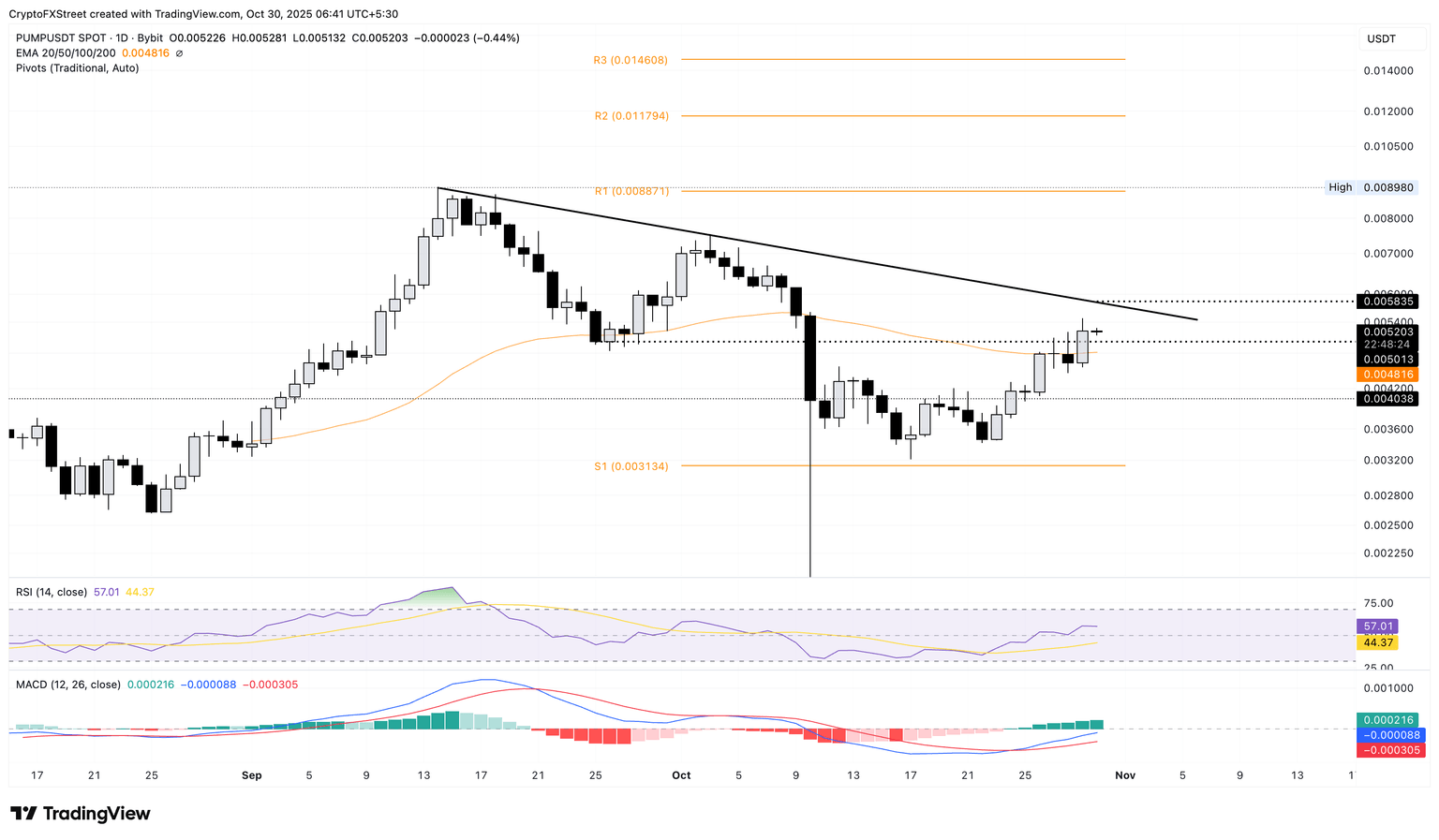 If PUMP reverses from $0.005835, it could retest the 50-day EMA at $0.004816.