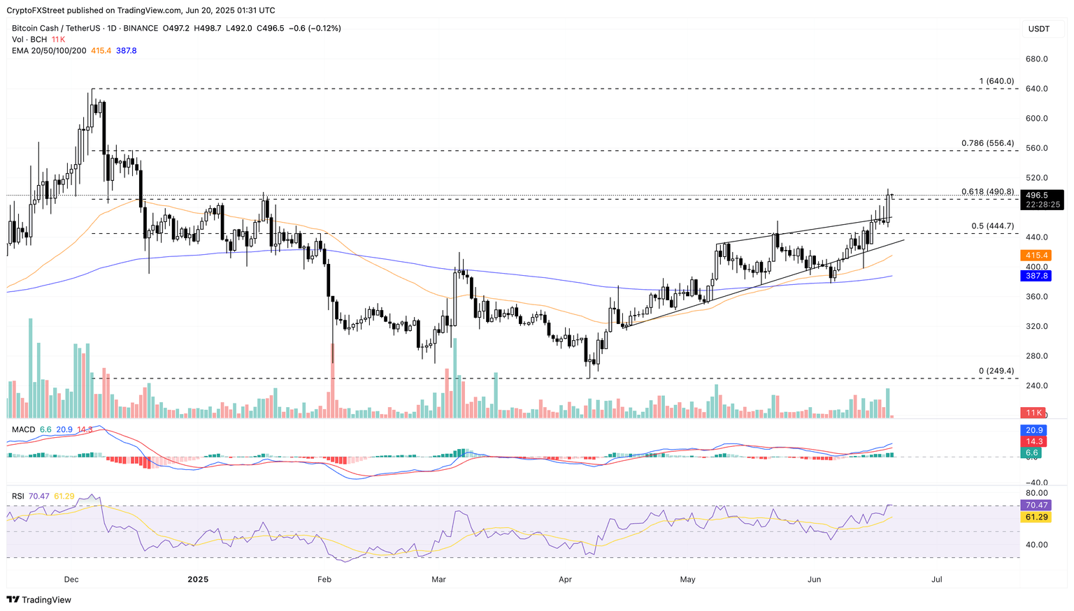 A closing above $500 could prolong the BCH uptrend towards the $556, aligning with the 78.6% Fibonacci level.