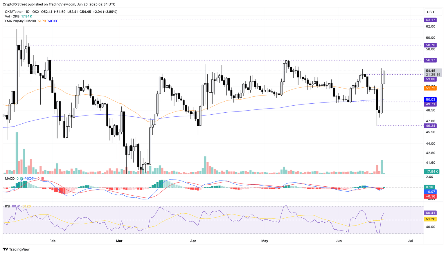 - OKB edges higher after an 8% rise on Thursday, hinting at a trend reversal rally as it reclaims $50.