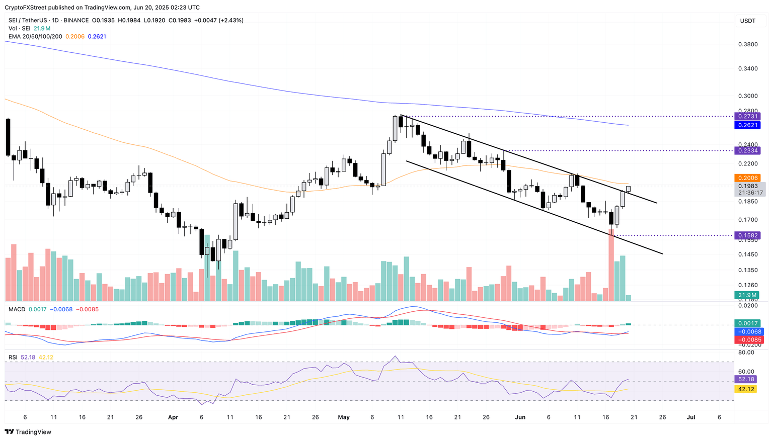 SEI prints its third consecutive bullish candle as it nears the $0.20 mark. At the time of writing, SEI edges higher by over 2% at press time on Friday, crossing a resistance trendline formed by declining peaks on May 11, May 23, May 29 and June 11.