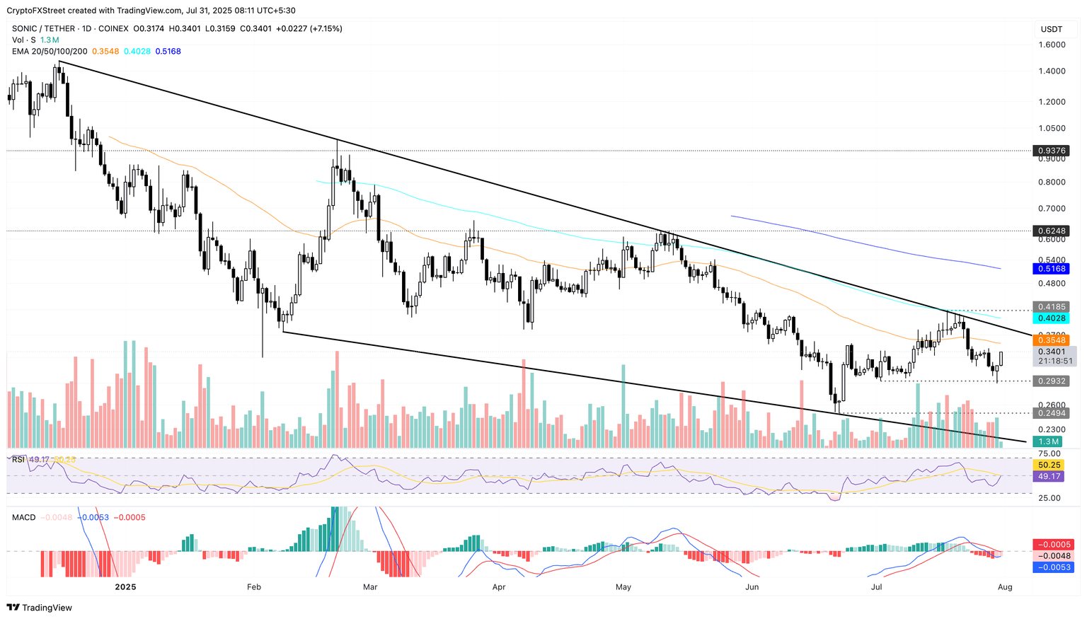 - Sonic holds above $0.30 with a short-term recovery within a falling wedge pattern.