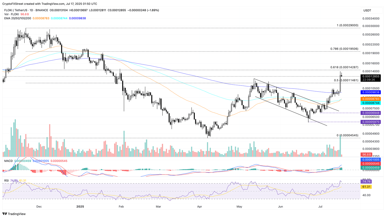 FLOKI edges lower by nearly 2% at press time on Thursday after bouncing off 30% higher from the 200-day Exponential Moving Average (EMA) on Wednesday. Floki's channel breakout rally gains traction as it reclaims the $0.000100 round figure.