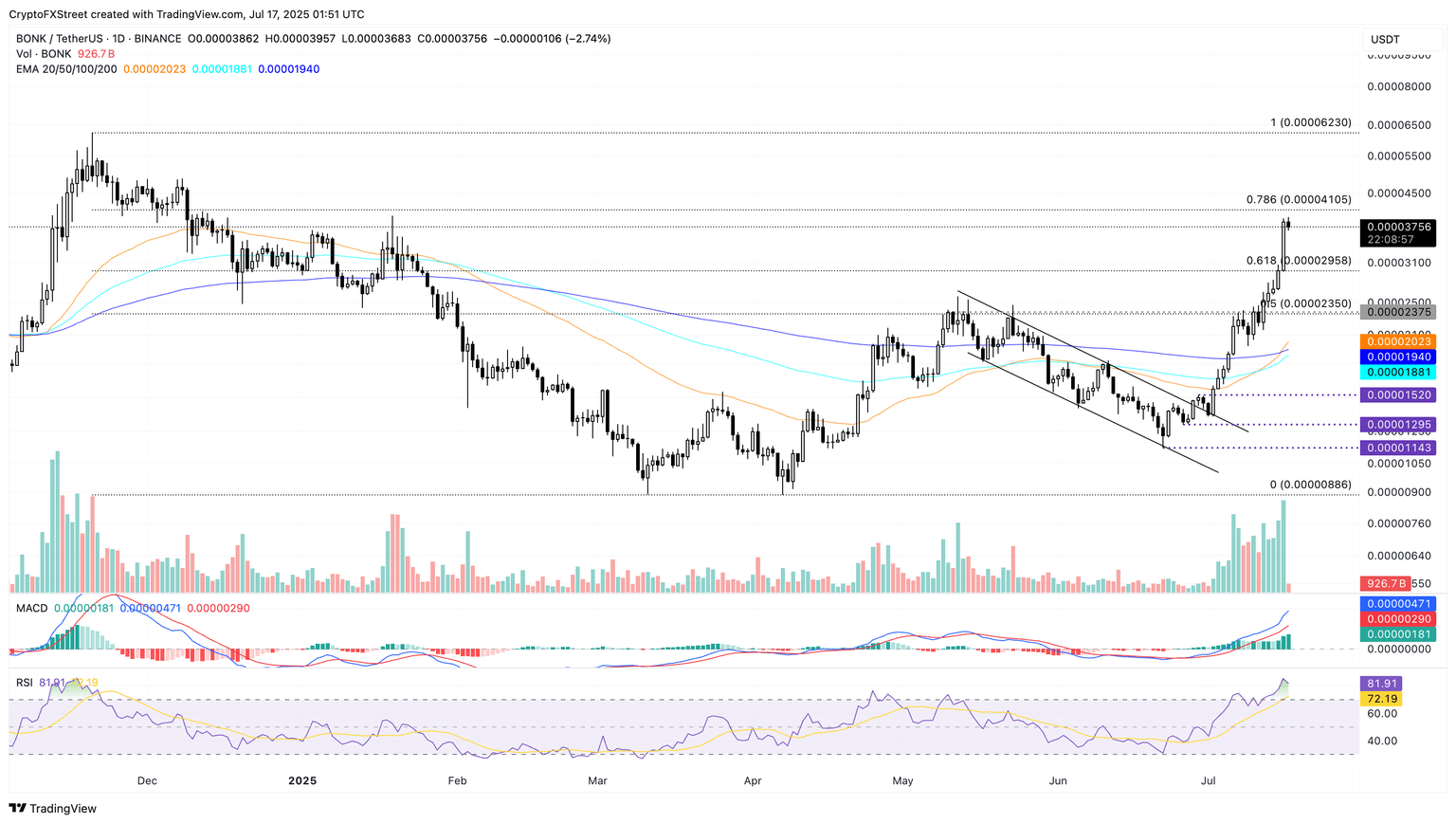 The meme coin struggles to surpass the 78.6% Fibonacci level at $0.00004105, retraced from the November 20 peak of $0.00006230 to the April 7 low of $0.00000886. A decisive push above this level could stretch the BONK rally to $0.00006230.