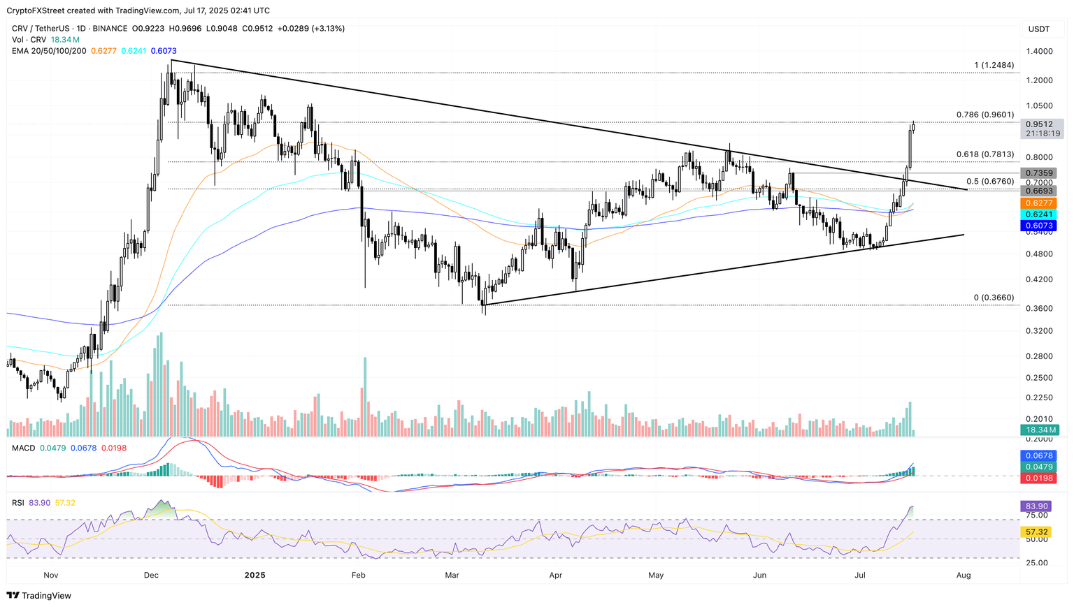 The altcoin marks a triangle breakout rally formed by converging resistance (connected by the December 7 and May 22 peaks) and a support trendline (connected by the March 10 and July 5 closes). The breakout rally reaches the 78.6% Fibonacci retracement level at $0.9601, retraced from $1.2484 on December 6 to $0.3660 on March 10.