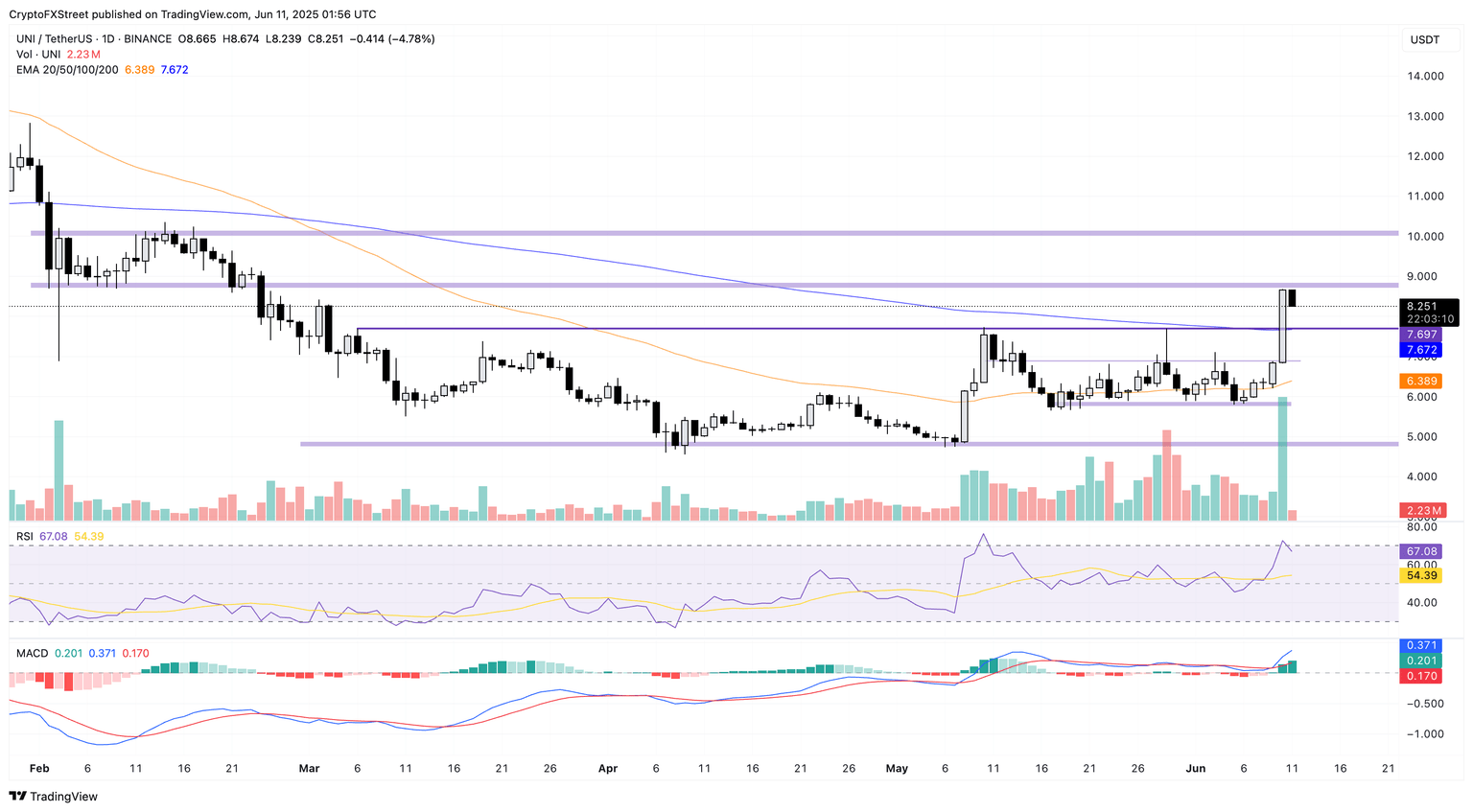 Uniswap edges lower by over 4% at press time on Wednesday after a spectacular performance of a 26% surge to close a bullish engulfing candle the day before. With a brief pause at $8.67, a three-month high, UNI reverses from the $8.70 supply ceiling to take a breather.