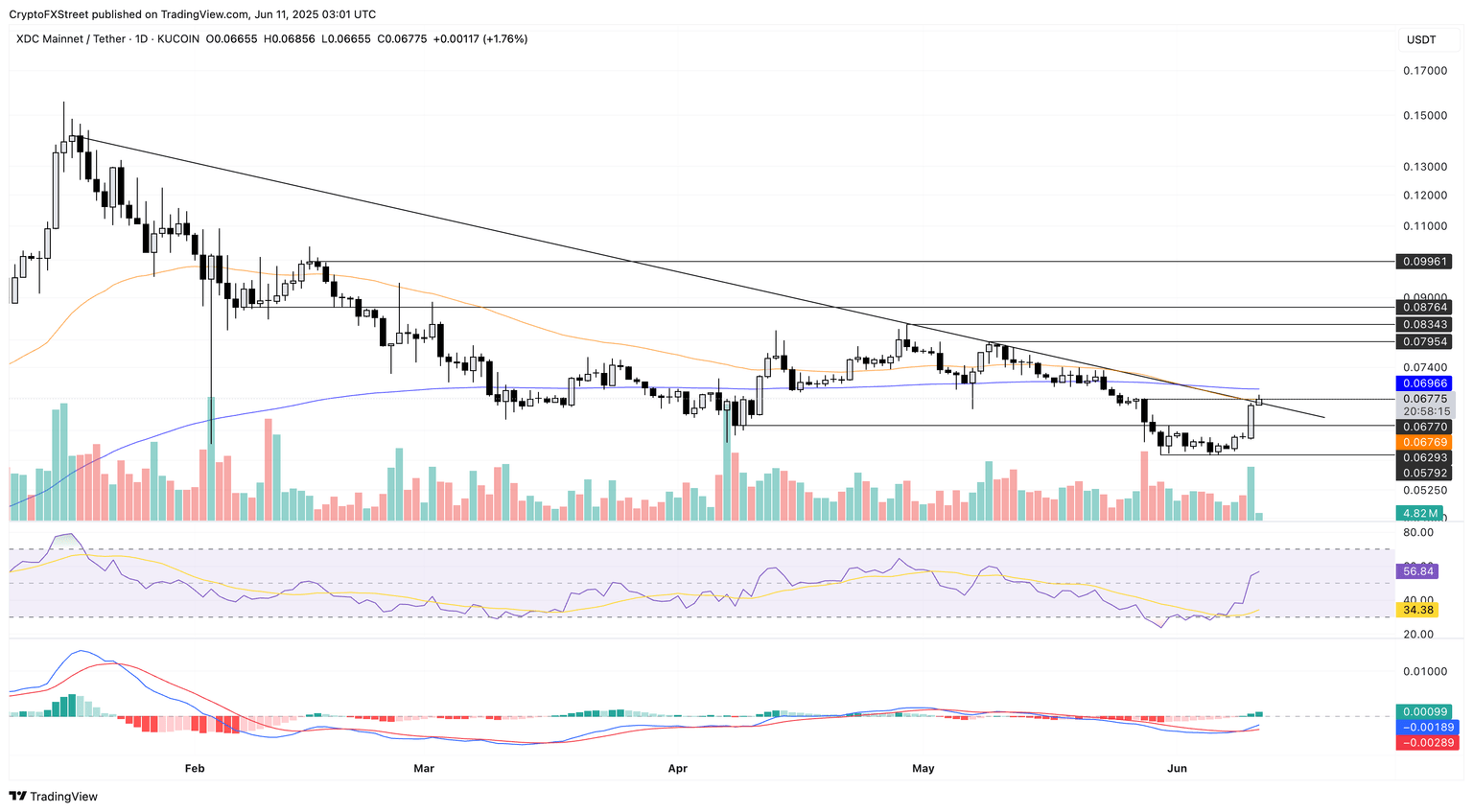 The recovery rally edges above a key long-standing resistance trendline formed by peaks on January 17, April 29, and May 23, signaling strong breakout chances. A closing above the trendline could propel XDC towards the May 23 peak at $0.07954.