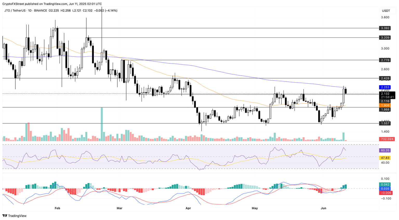 Jito, a Solana-based DeFi token, surged 14% on Tuesday, printing its fifth consecutive bullish candle on the daily chart. However, JTO fails to cross above the 200-day EMA at $2.25, resulting in a pullback of over 4% at press time on Wednesday.