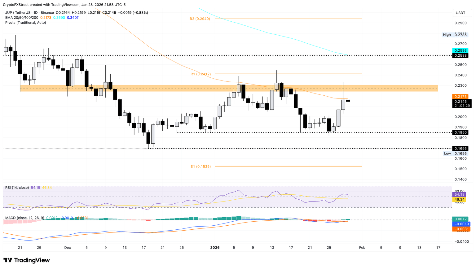 If JUP clears the 50-day EMA, a deeper resistance at the $0.2240-$0.2308 zone could limit the upside.