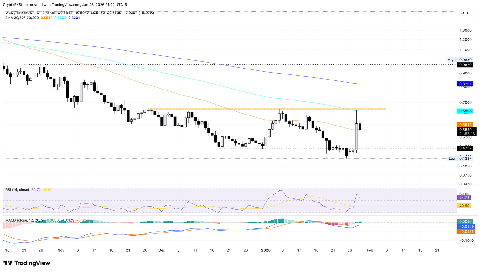 If WLD clears the 100-day EMA at $0.6503, it could extend recovery to the 200-day EMA at $0.8201.