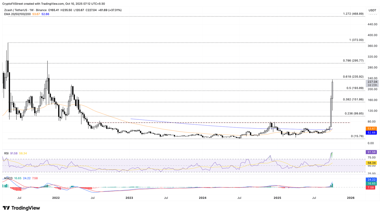 Zcash trades above $225 at press time on Friday, recording over 35% gains so far this week. The third consecutive week of profits challenges the 61.8% Fibonacci retracement level at $235.92, drawn from the May 2021 high at $372.00 to the July 2024 low at $15.78 on the weekly chart.