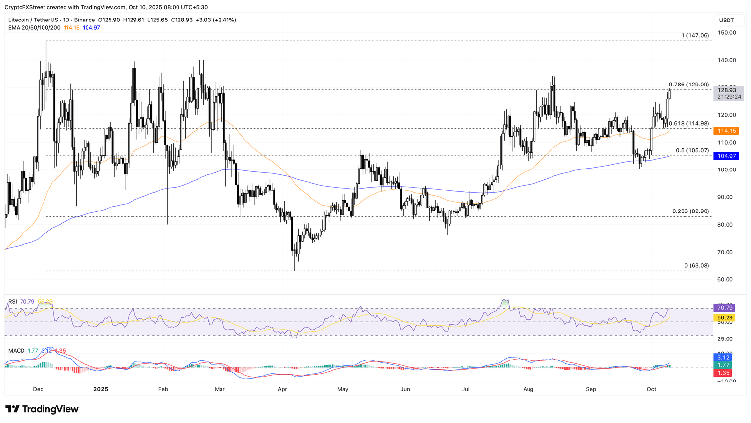Advancing the uptrend for the third consecutive day, Litecoin challenges the 78.6% Fibonacci retracement level at $129.09, retraced from the $147.06 peak of December 5 to the $63.08 low of April 7.
