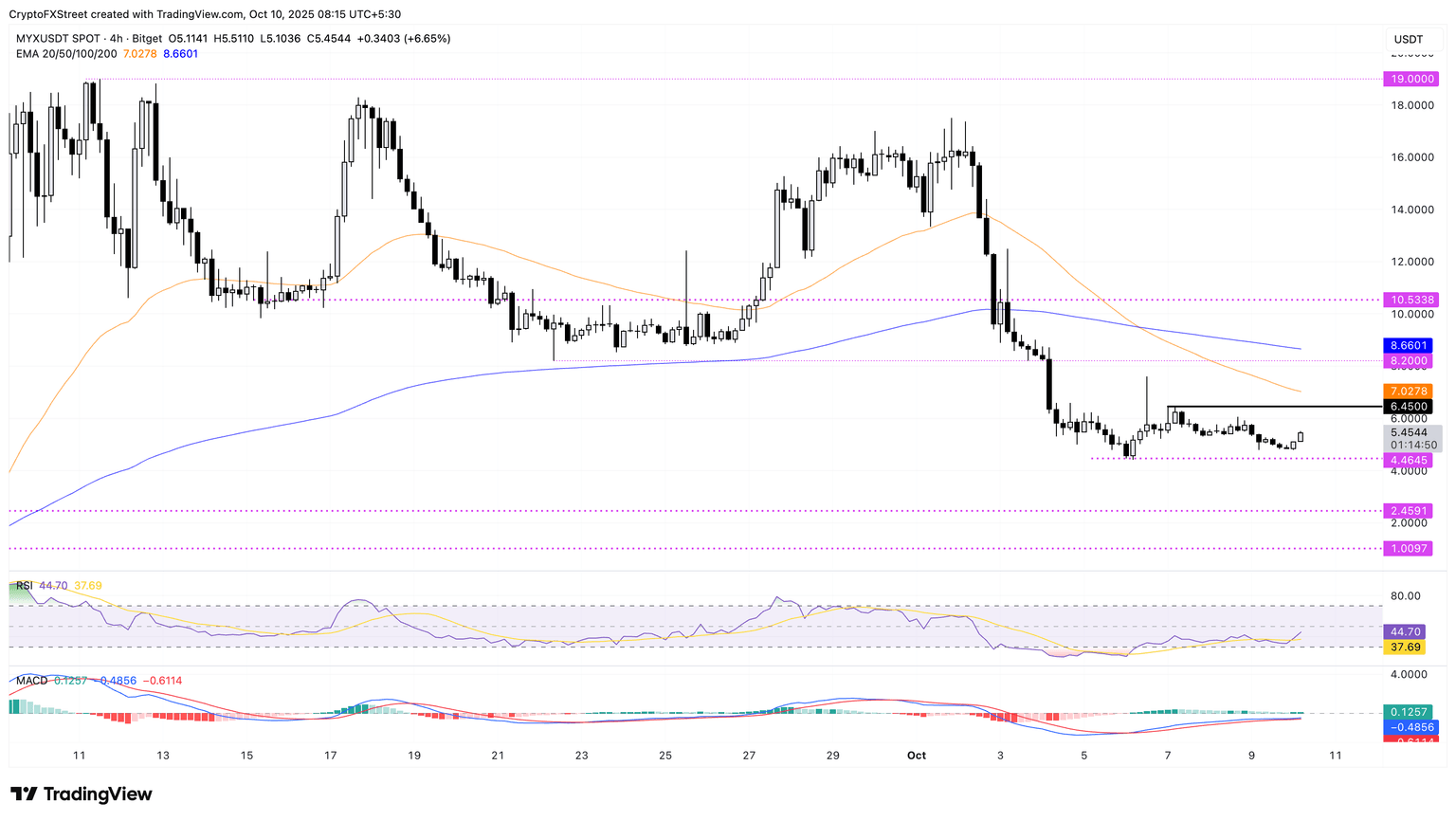 MYX Finance ticks higher by 6% at press time on Friday after three consecutive days of losses. The recovery in MYX stems from above the $4.4645 low of Monday, extending the consolidation range with the upper ceiling at $6.4500.
