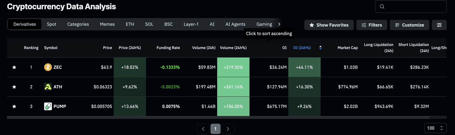 CoinGlass data shows a significant increase in Open Interest of Zcash, Pump.fun, and Aethir over the last 24 hours, indicating a risk-on sentiment among traders. The OI of ZEC, PUMP, and ATH has increased by 44%, 9% and 16% in the last 24 hours, reaching $26.24 million, $675.17 million, and $127.94 million, respectively.
