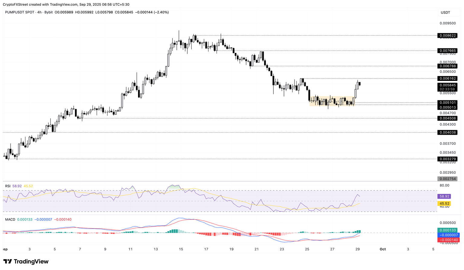 The recovery run faces resistance in reaching the $0.006162 level. Still, if the uptrend continues with a clean push above this level, PUMP could reach the $0.006788 level, last visited on September 21.