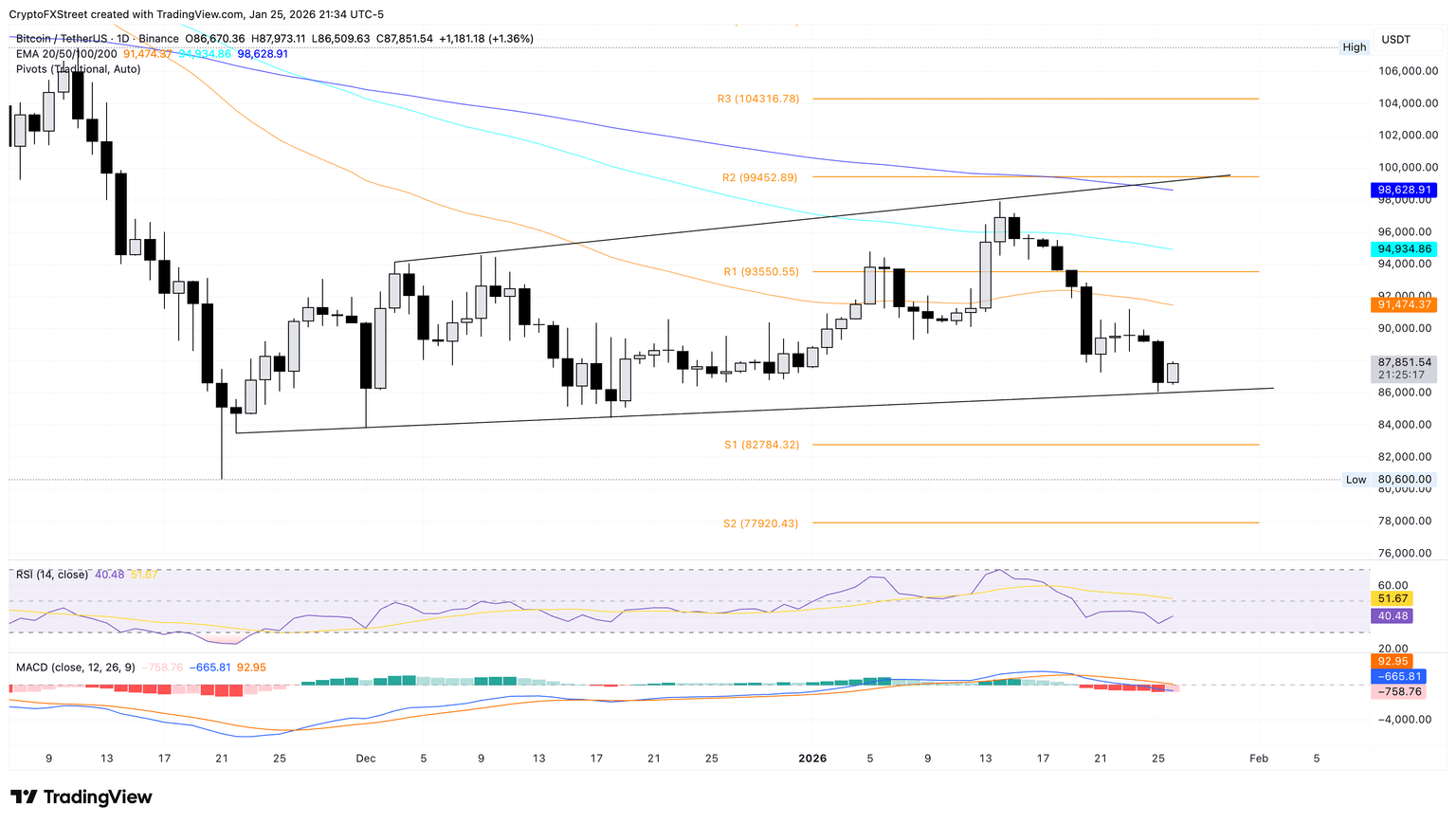 Bitcoin sits beneath the 50-, 100-, and 200-day EMAs, preserving a bearish stack. The 50-day EMA at $91,474 remains below the 100-day EMA at $94,934, while the 200-day EMA at $98,628 slopes down, capping recovery attempts.
