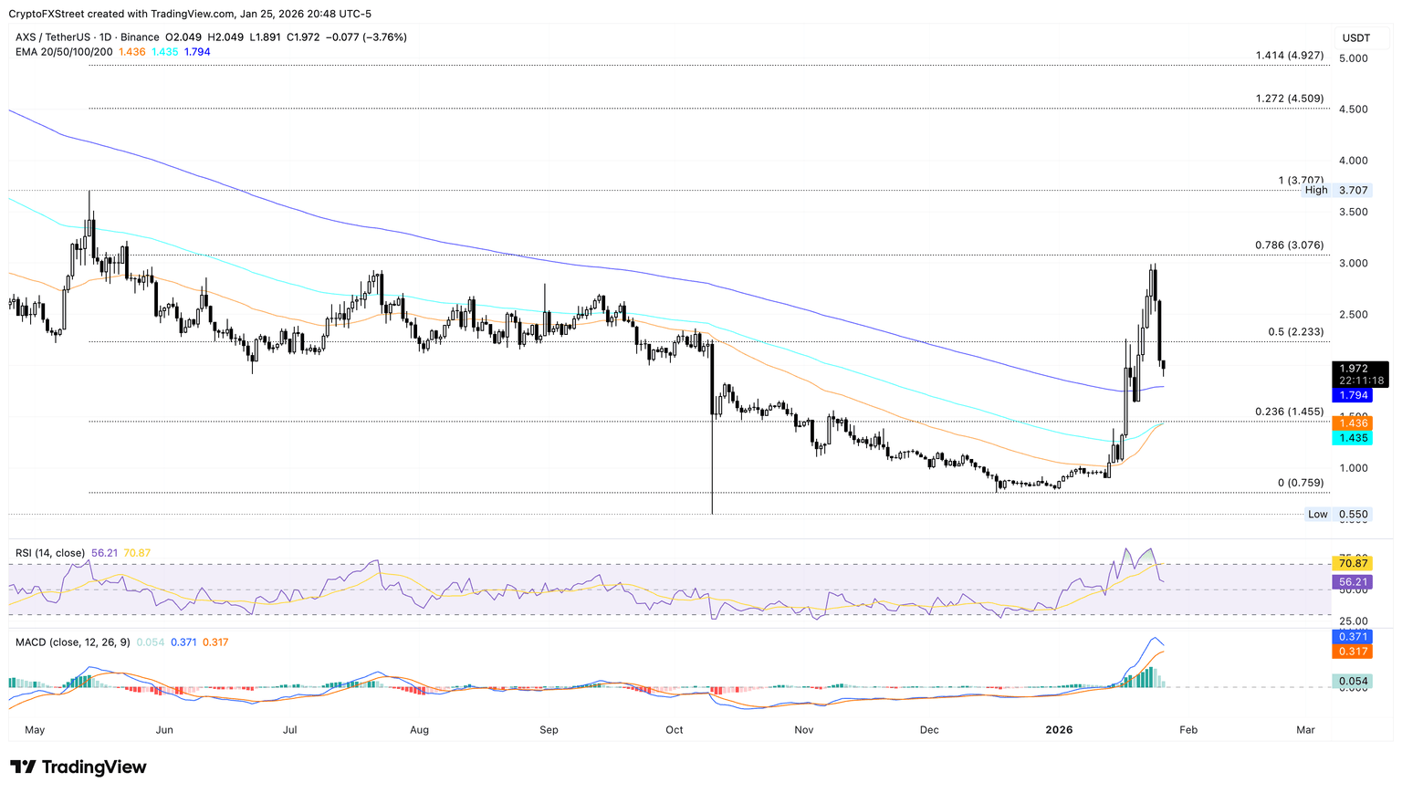 AXS approaches the 200-day EMA at $1.79 as the nearest support after breaching the 50% retracement level at $2.23, measured from the May 14 high at $3.70 to the December 17 low at $0.75.