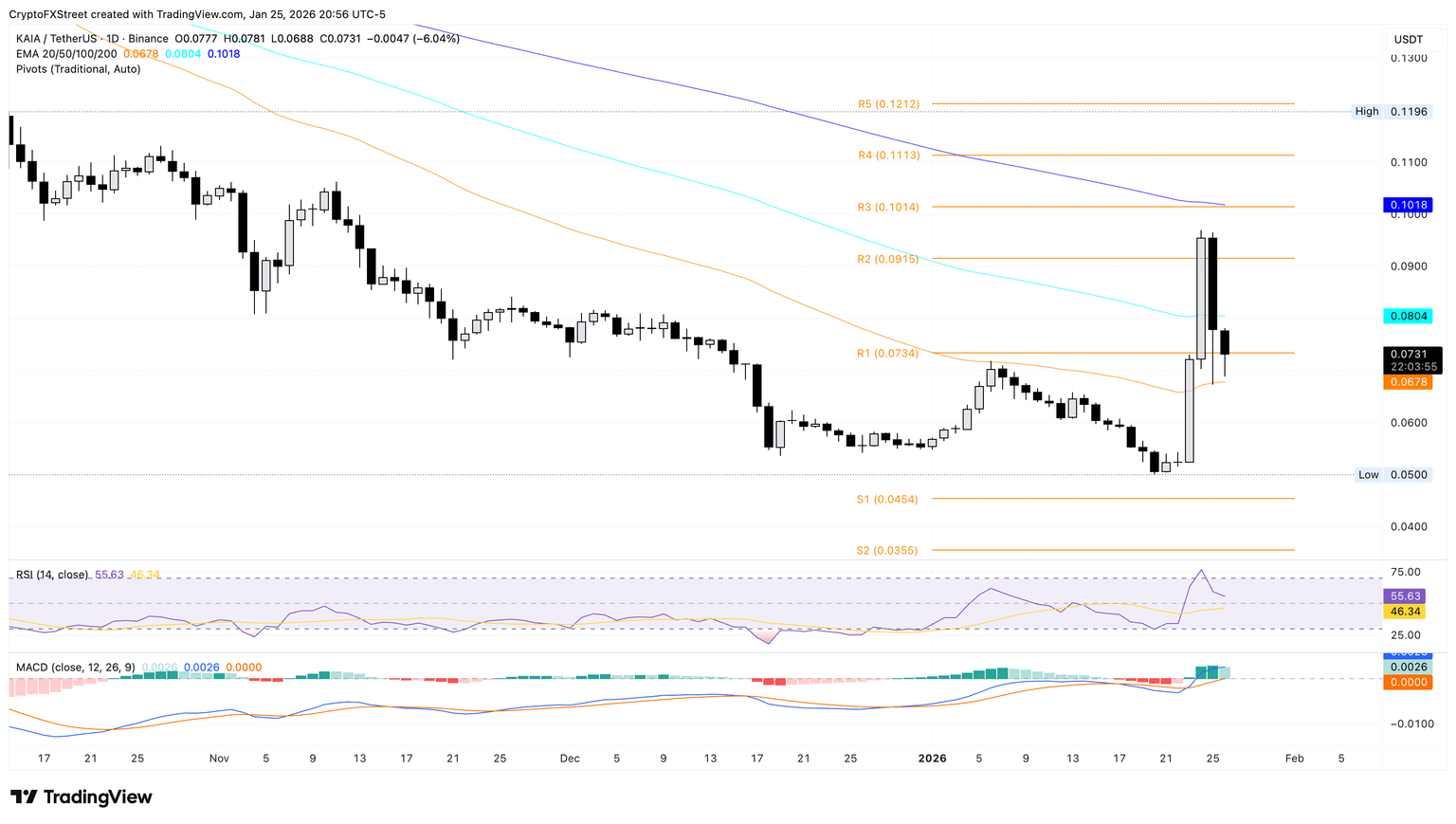 Kaia is down 6% at the time of writing on Monday, extending the 18% decline from Sunday. The pullback in KAIA risks erasing the 32% gains from Saturday with a close below the R1 Pivot Point at $0.0735.