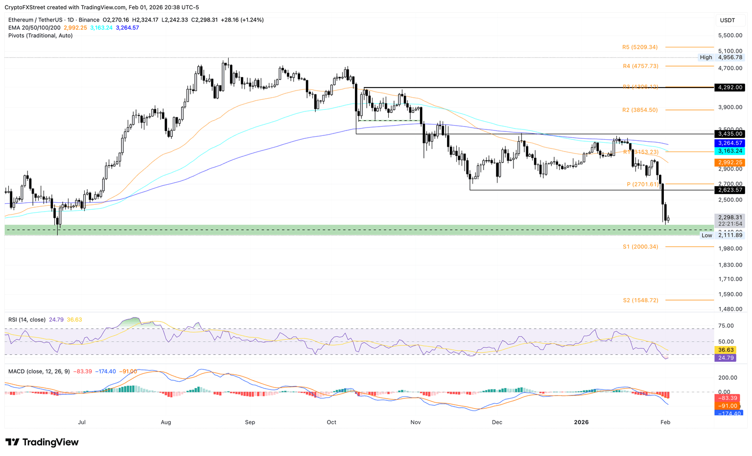 - Ethereum falls below $2,300 toward a critical support zone after five consecutive days of decline, representing a 25% decline.