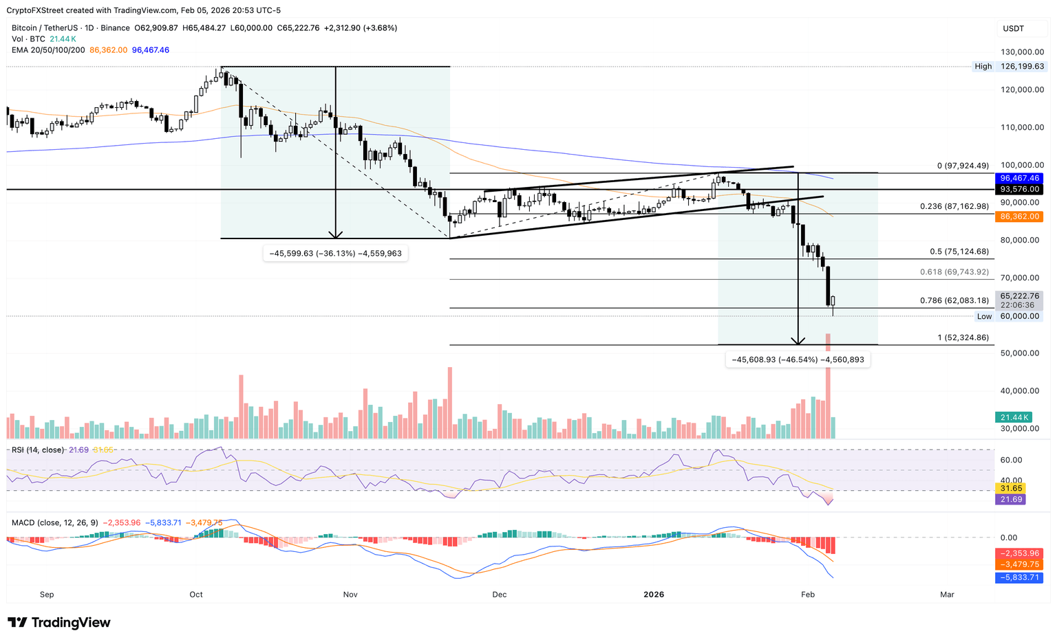Bitcoin is down roughly 50% from its all-time high of $126,199 on October 6, putting the broader market under pressure. On the daily chart, Bitcoin holds above the 78.6% trend-based Fibonacci retracement level at $62,083, which is measured within a bearish flag pattern, as previously reported by FXStreet.
