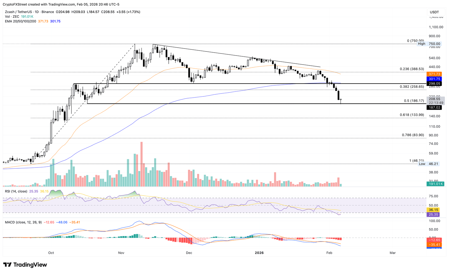 Zcash holds above $200 at press time on Friday after an 18% decline the previous day. The privacy coin extends the decline below the 200-day EMA as the 50-day EMA continues to slope lower, preserving a bearish backdrop.