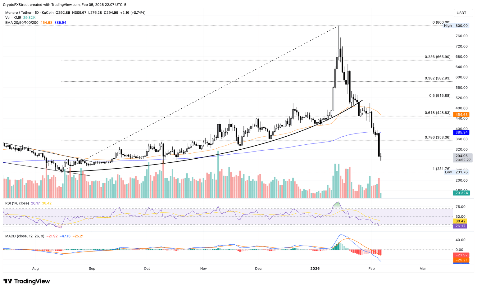 Monero struggles below the $300 area at press time on Friday, following Thursday's 23% decline, which formed a bearish Marubozu candle. The privacy coin remains well below the 50-day Exponential Moving Average (EMA) at $454 and the 200-day EMA at $385, reinforcing a bearish setup.