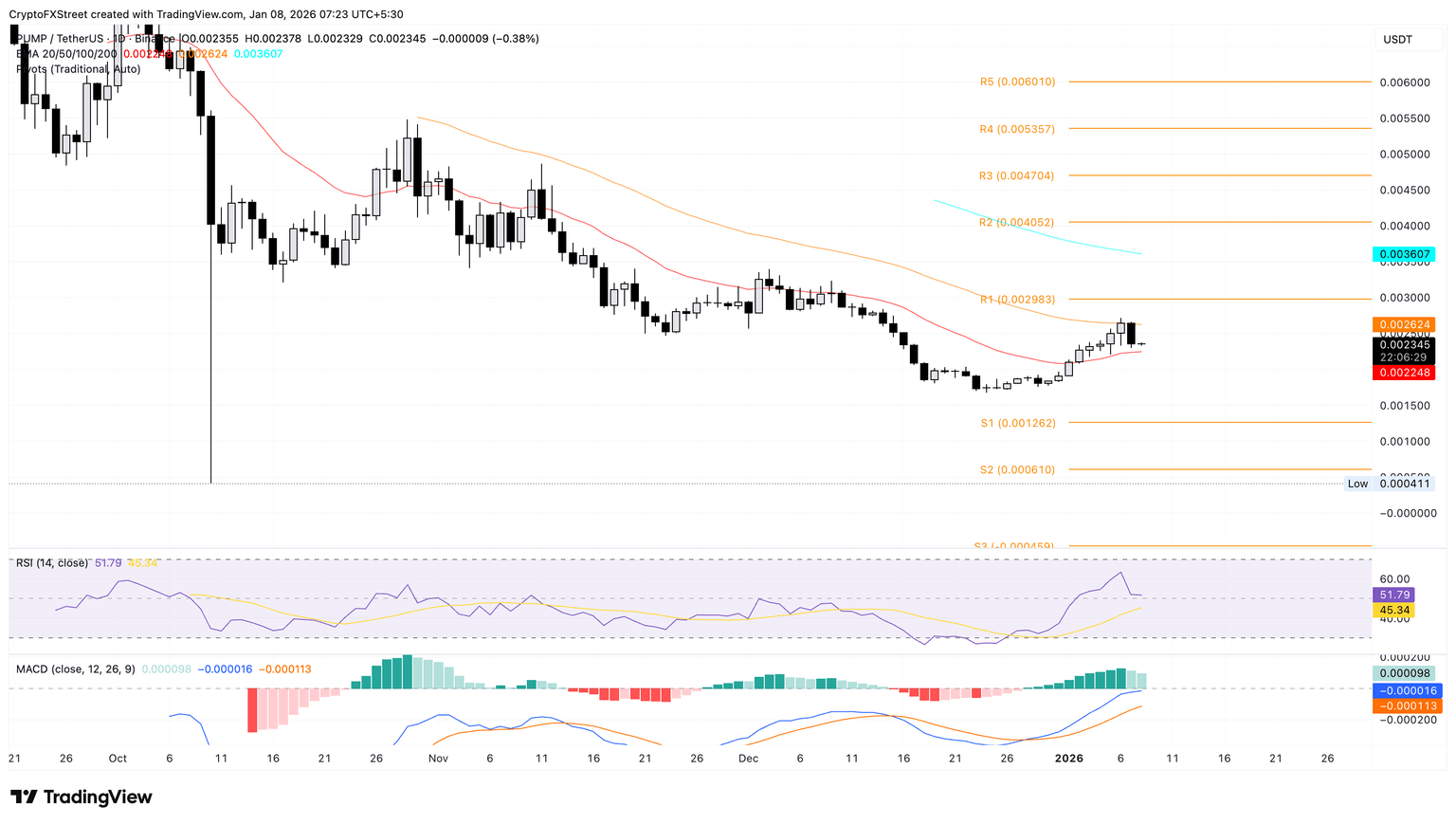 If PUMP rebounds to clear the 50-day EMA at $0.002624, it could target the R1 Pivot Point at $0.002983.