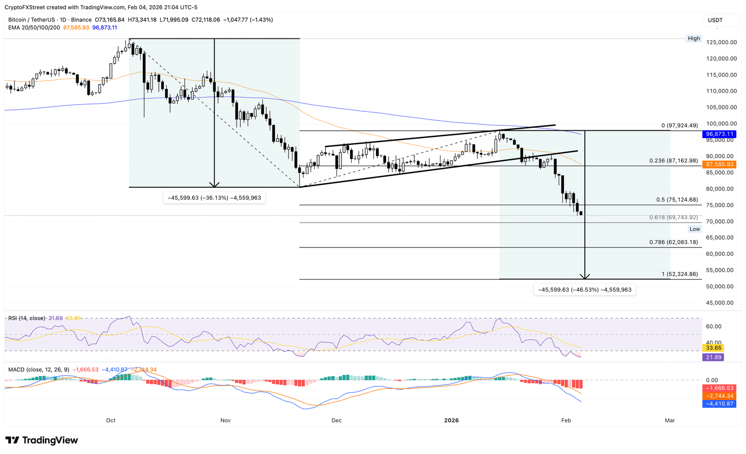 Bitcoin trades near $72,000, with a more than 1% loss at press time on Thursday, extending the decline for the third consecutive day. The major crypto is far below the 50- and 200-day Exponential Moving Averages (EMAs), which are sloping lower in a bearish configuration.
