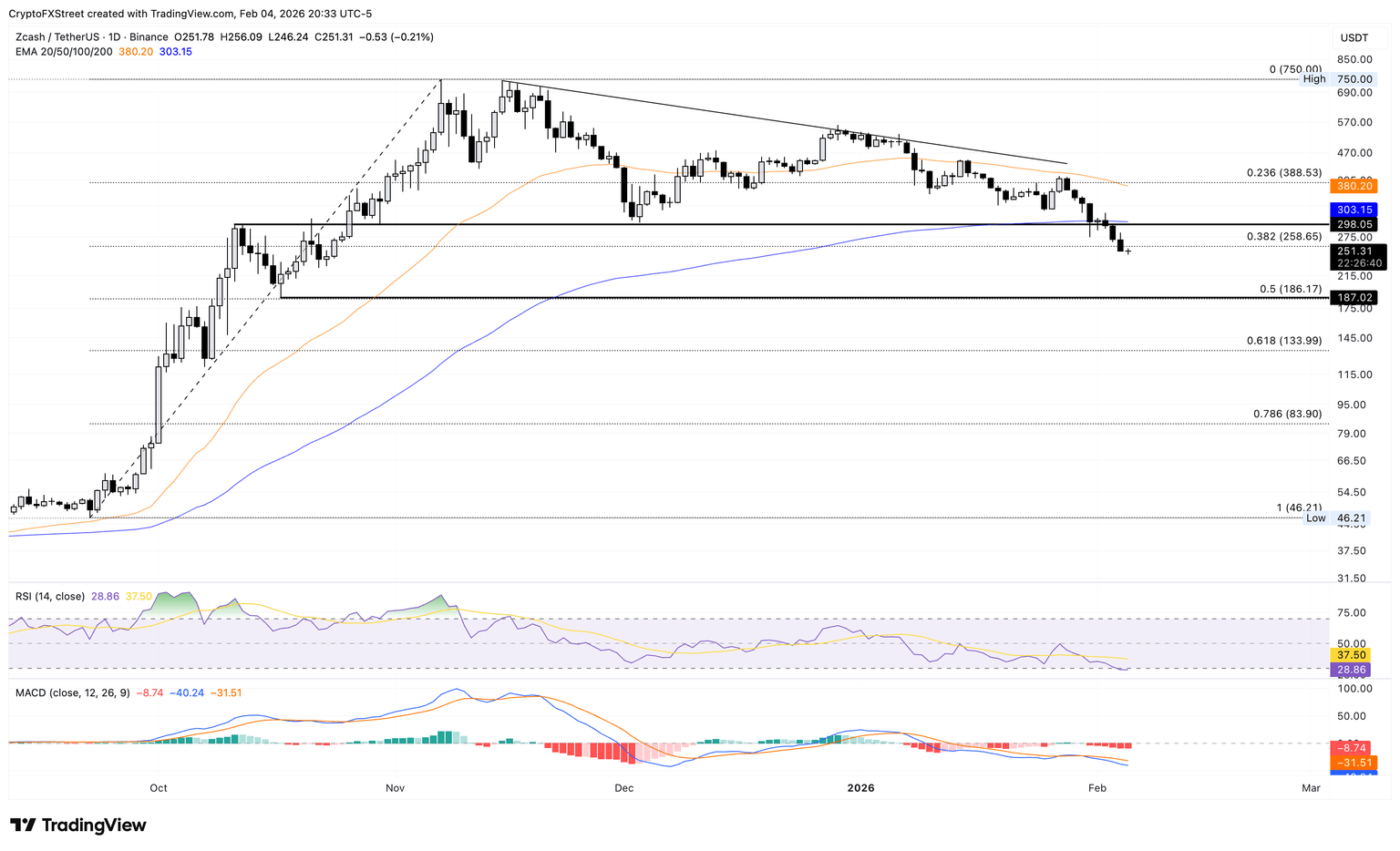 Zcash trades near $250 at press time on Thursday, below the 50- and 200-day EMAs, which slope downward and are approaching a potential Death Cross pattern. The privacy coin reversed to the downside at the $300 mark, aligning with the 200-day EMA, crossing the 38.2% Fibonacci retracement level at $258, measured from the September 22 low at $46 to the November 7 high at $750.