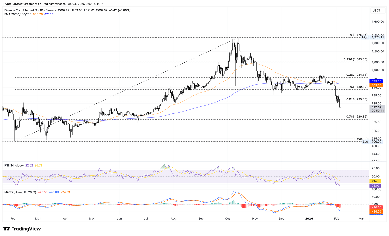 BNB dropped below $700 so far on Thursday, marking its third consecutive bearish week. The exchange token remains well below the 50-day EMA at $863 and the 200-day EMA at $875 while the shorter average extends its decline beneath the longer one after the Death Cross pattern on Monday, maintaining a bearish alignment.