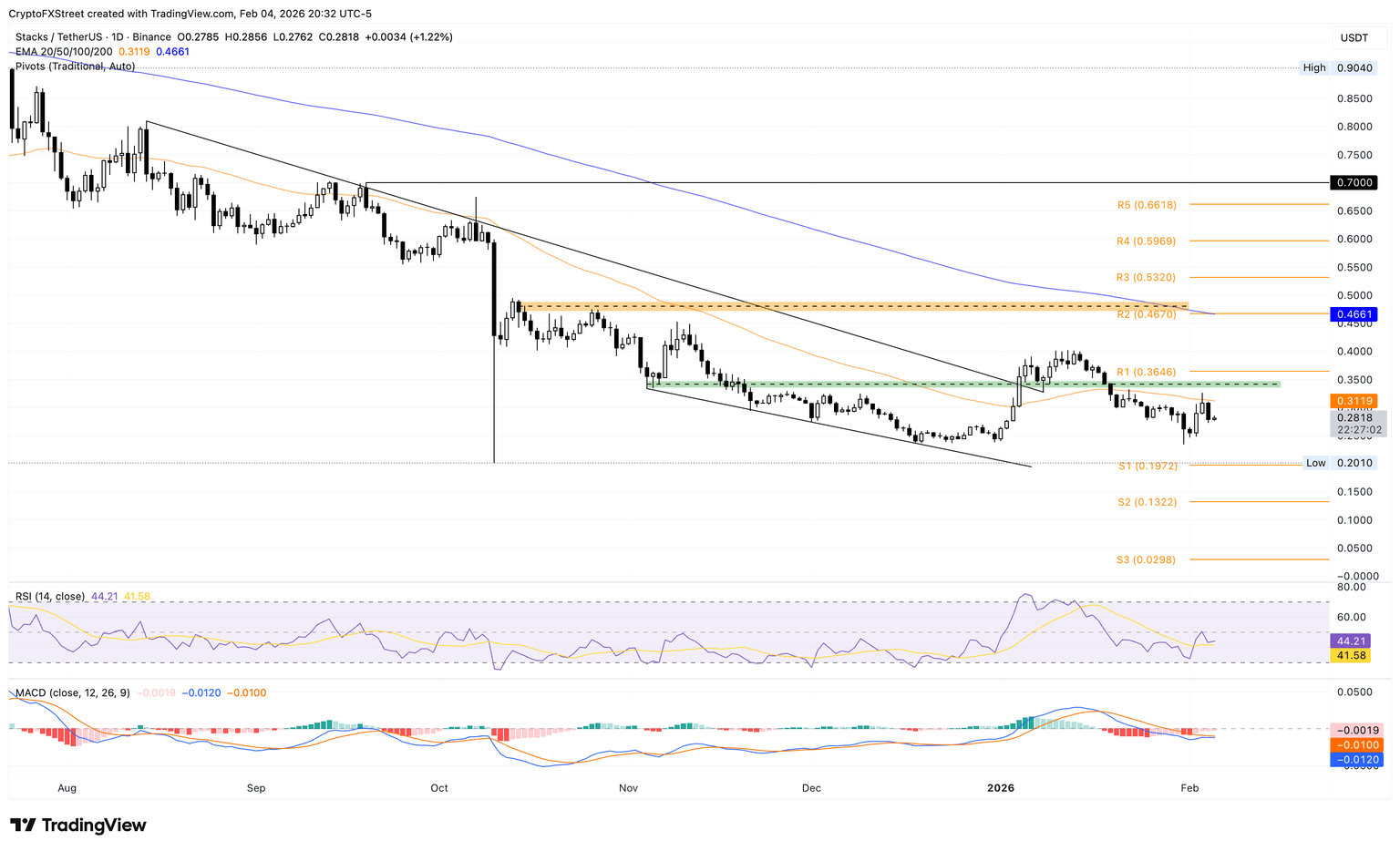 Looking down, the key support for Stacks remains the October 10 low at $0.2010.