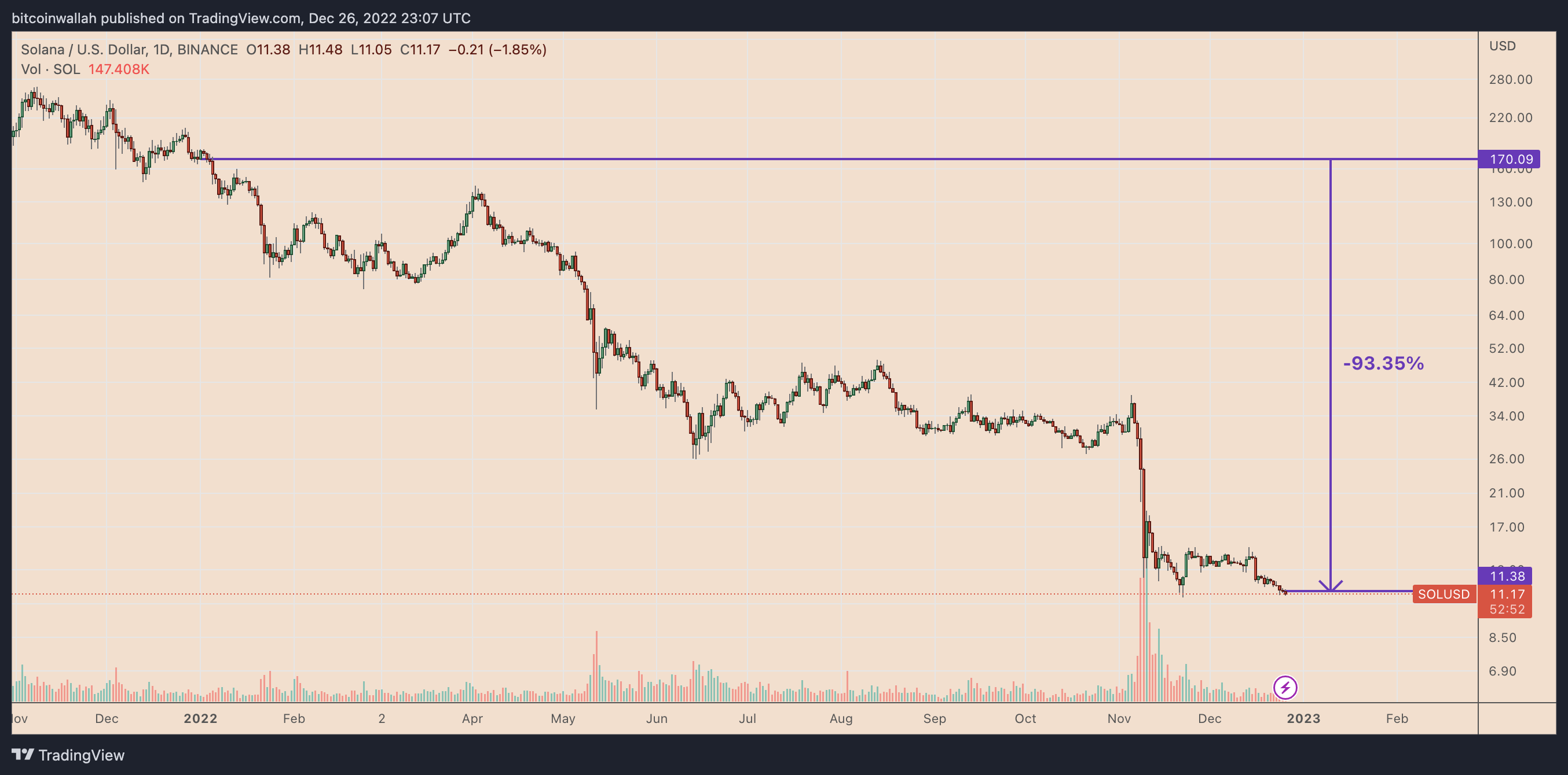 Solana (SOL $11), a layer-1 blockchain protocol, crashed 93.35% YTD due to a sequence of bad news all across 2022. That includes six network outages in the year, a $200 million hack on a Solana-based wallet and Solana’s association with FTX.