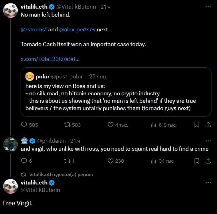 In a widely shared social media post, Buterin declared, "No man left behind," while emphasizing the need to free these developers, who he believes were unfairly targeted.