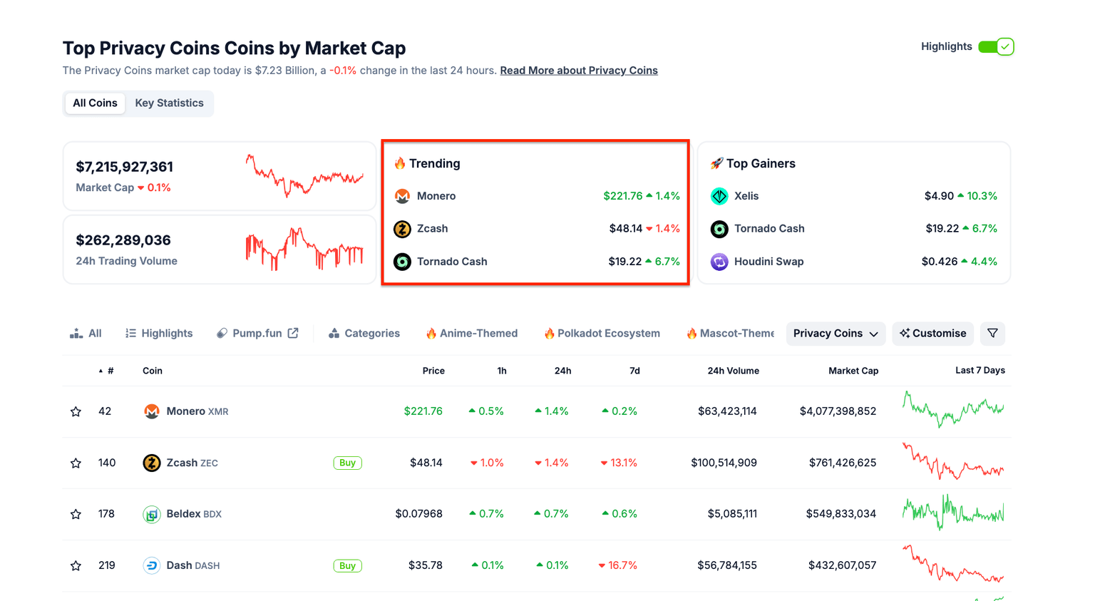 Coingecko data shows a sharp rise in search interest for these assets within the last 24 hours, underscoring growing investor enthusiasm for privacy solutions.