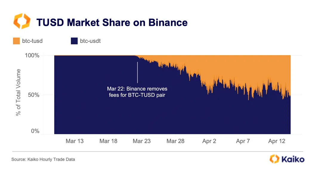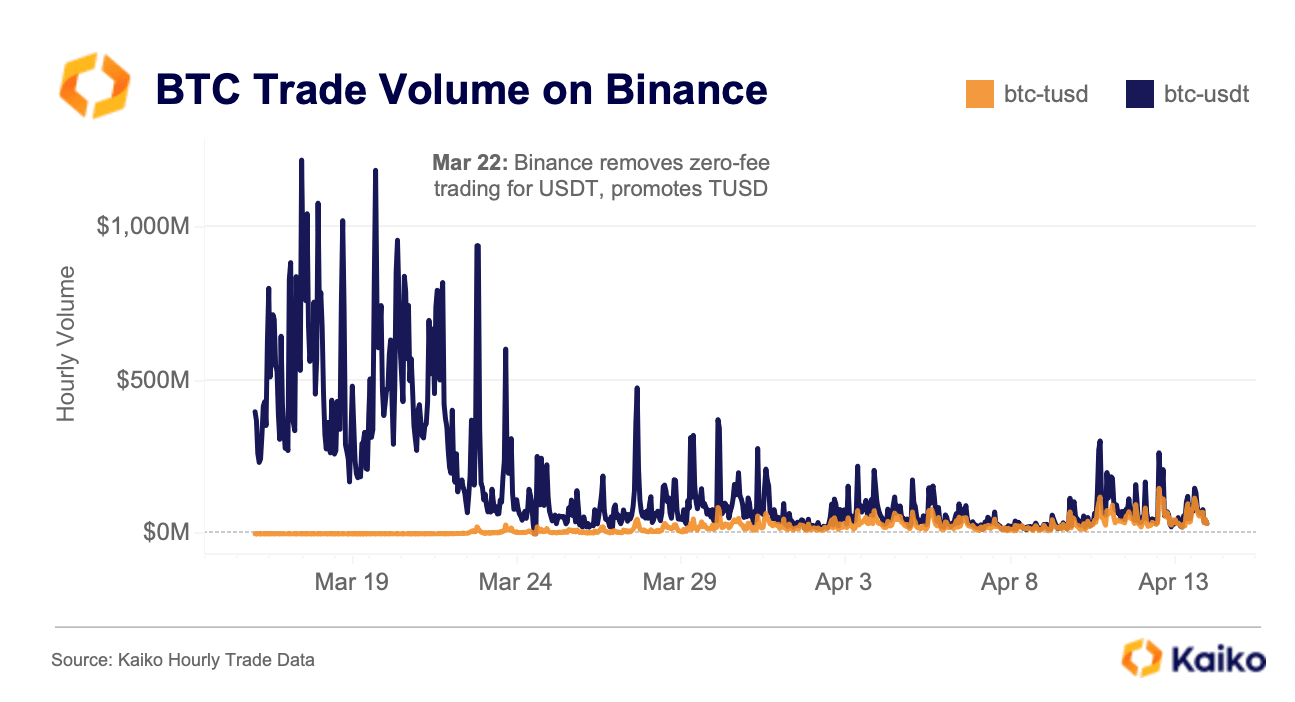 Kaiko data shows that while the change is commendable, the growth recorded by TUSD is not enough to neutralize or countervail the lead in the BTC/USDT pair's trading volume even after Binance relinquished its zero-fee discount for Tether.