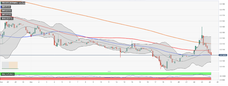 TRX/USD moved below the support area of $0.0140 ( the middle line of 4the daily Bollinger Band. As a result, the price continued the decline towards $0.0135 (SMA50 4-hour). If it gives way, psychological $0.0130 will come into focus. The next support is created by the lower line of the 4-hour Bollinger Band and the recent bottom at $0.0121.