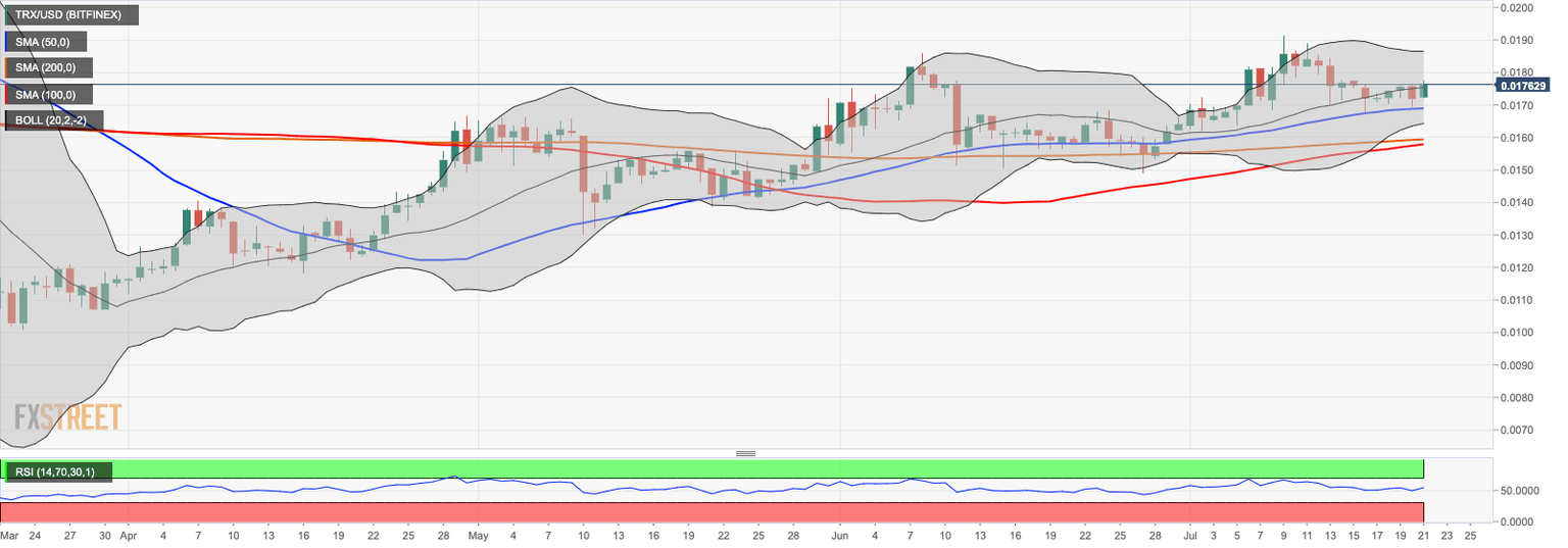 At the time of writing, TRX/USD is changing hands at $0,0176, having gained 2.8% since the beginning of Tuesday. The local support for the coin is created by $0.01750 (the middle line of the daily Bollinger Band) followed by a psychological $0.01700. The coin recovered above 100-hour SMA, which is a bullish short-term signal. The sell-off may be extended towards 50-day SMA at $0.01688 and $0.01600. This psychological barrier is reinforced by a combination of 100-day and 200-day SMAs.