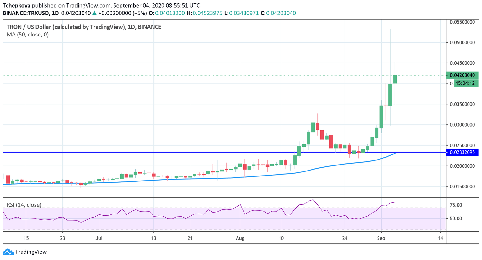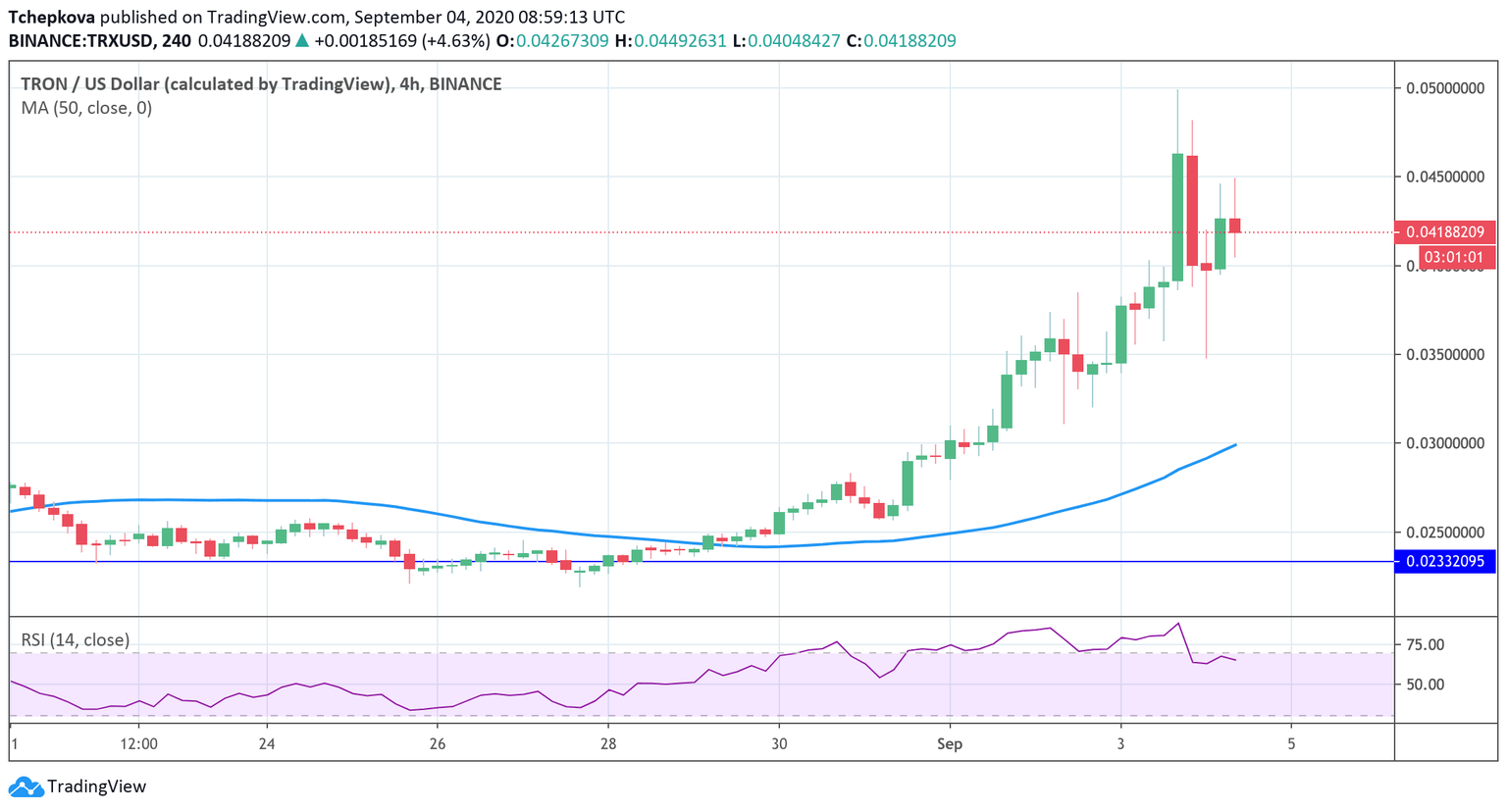 TRON's TRX has been one of the best-performing digital assets out of top-20 recently. The coin has gained over 15% on a day-to-day basis and over 80% on a weekly basis. At the time of writing, TRX is changing hands at $0.0438. The coin has jumped to the ninth position in the global cryptocurrency rating, with the current market capitalization of $3 billion. An average daily trading volume surpassed $7 billion in the recent 24 hours, which is over 700% increase compared to average daily trading volumes registered during the previous week.