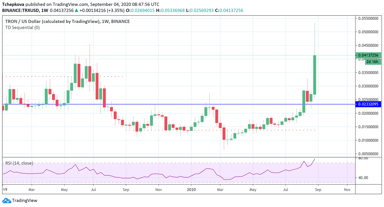 - TRX/USD is dangerously overbought after rallying 80% in a single week.