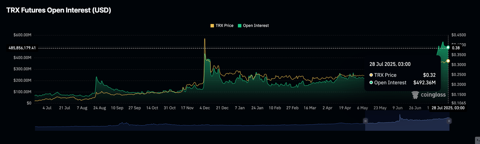 - Investor interest in TRX remains strong, backed by steady funding rate and elevated futures Open Interest.