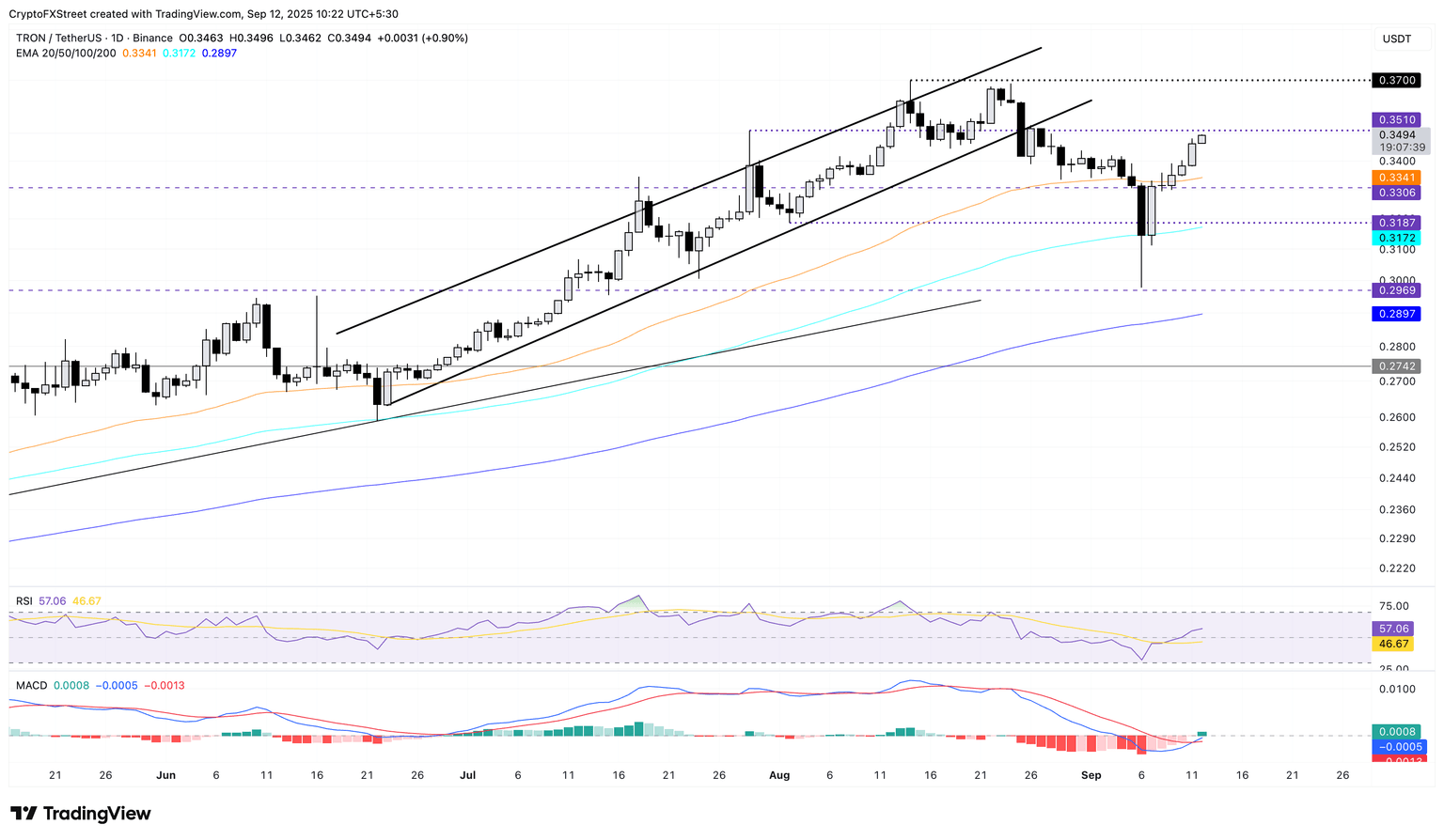 Tron forms a V-shaped recovery pattern on the daily chart by bouncing off the 100-day Exponential Moving Average following the rising channel breakdown in late August. At the time of writing, Tron trades above $0.3400 on Friday, inching close to the $0.3510 resistance marked by the July 29 high, which also acts as the neckline of the V-shaped pattern.