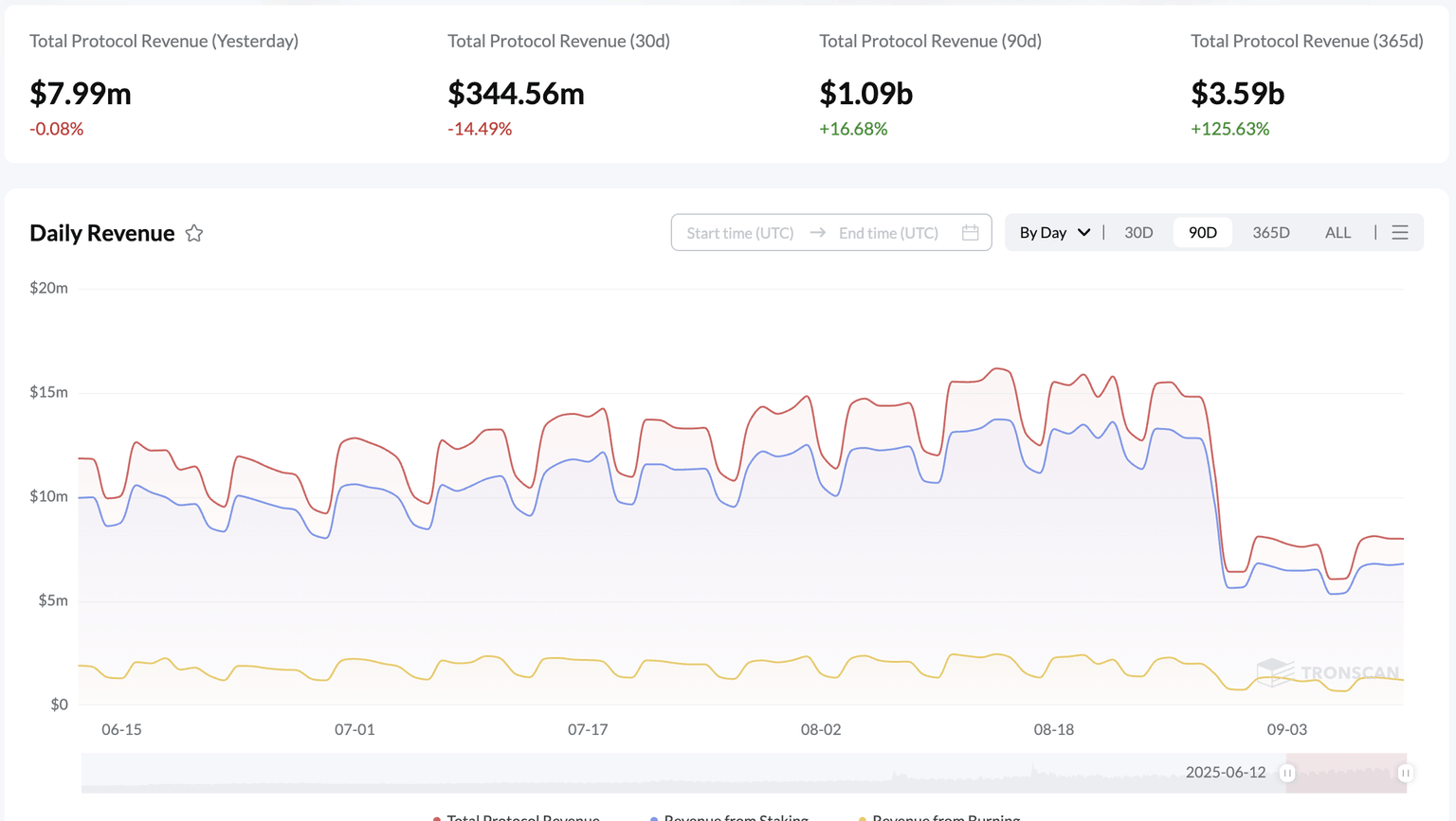Meanwhile, the on-chain data reveals an underlying weakness, as network revenue has dropped significantly this week. TronScan data shows that the total protocol revenue collected on Thursday amounted to $7.99 million. This represents a significant decrease in revenue compared to the late August collections of over $15 million.
