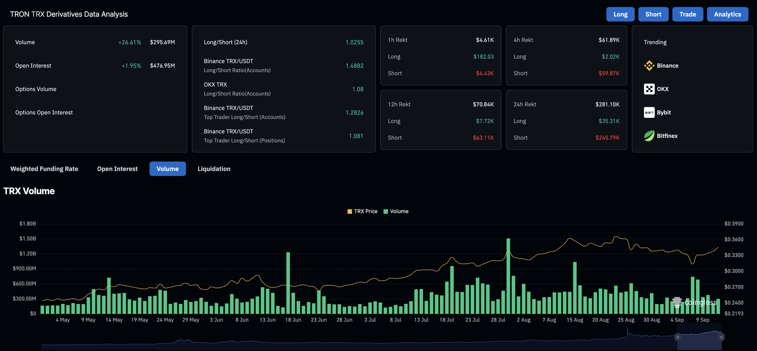 The retail demand for Tron is on the rise, resulting in a surge in TRX Open Interest (OI) and short liquidations. CoinGlass data shows that the TRX OI has surged by nearly 2% over the last 24 hours, reaching $476.95 million. This upsurge in capital inflows in TRX highlights the increased demand among traders.