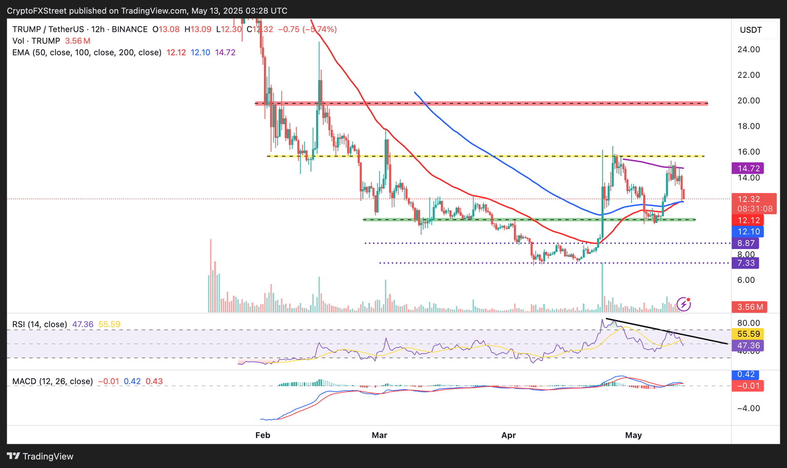 - TRUMP meme coin could uphold confluence support at $12.11, established by the 12-hour 50- and 100 EMAs.